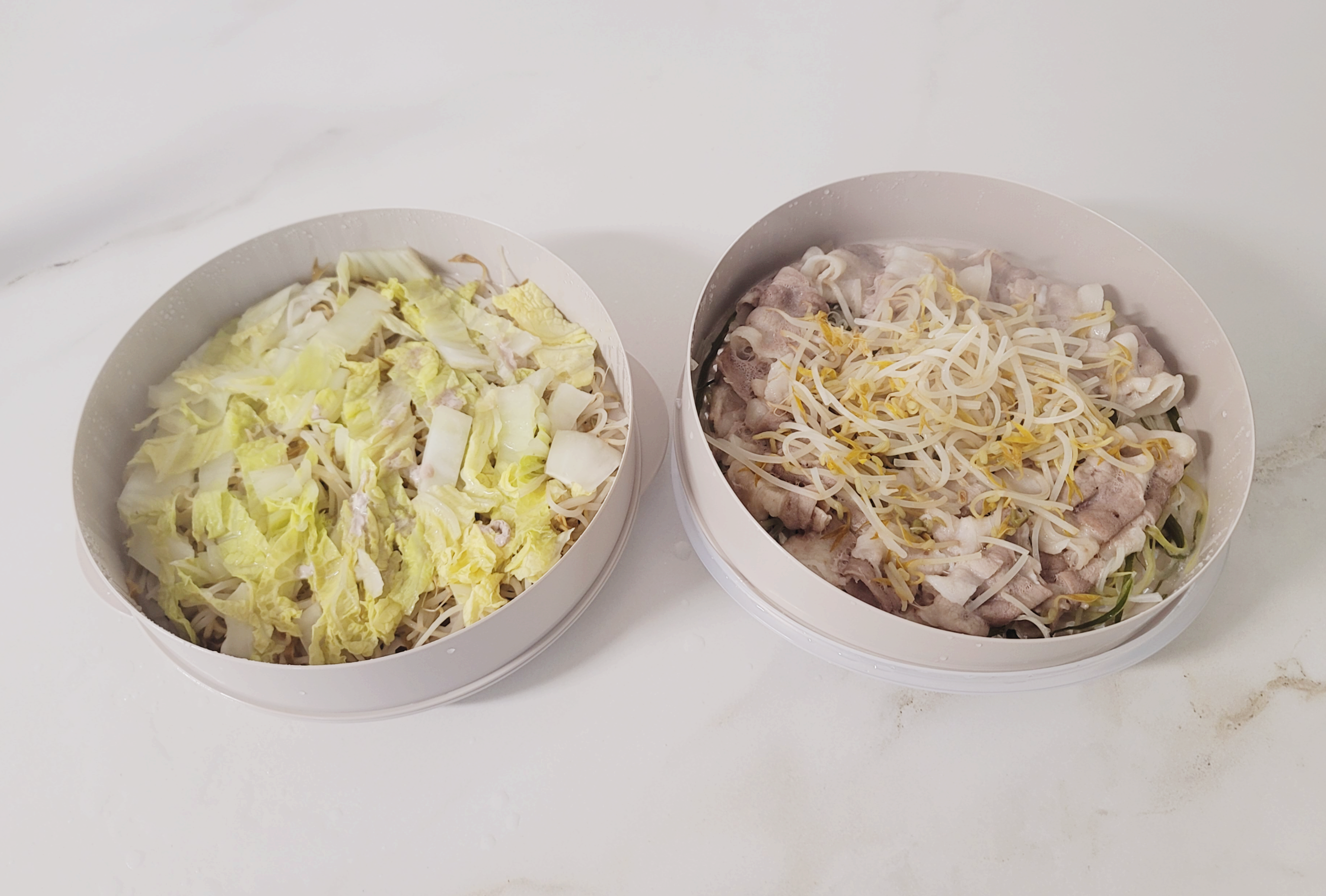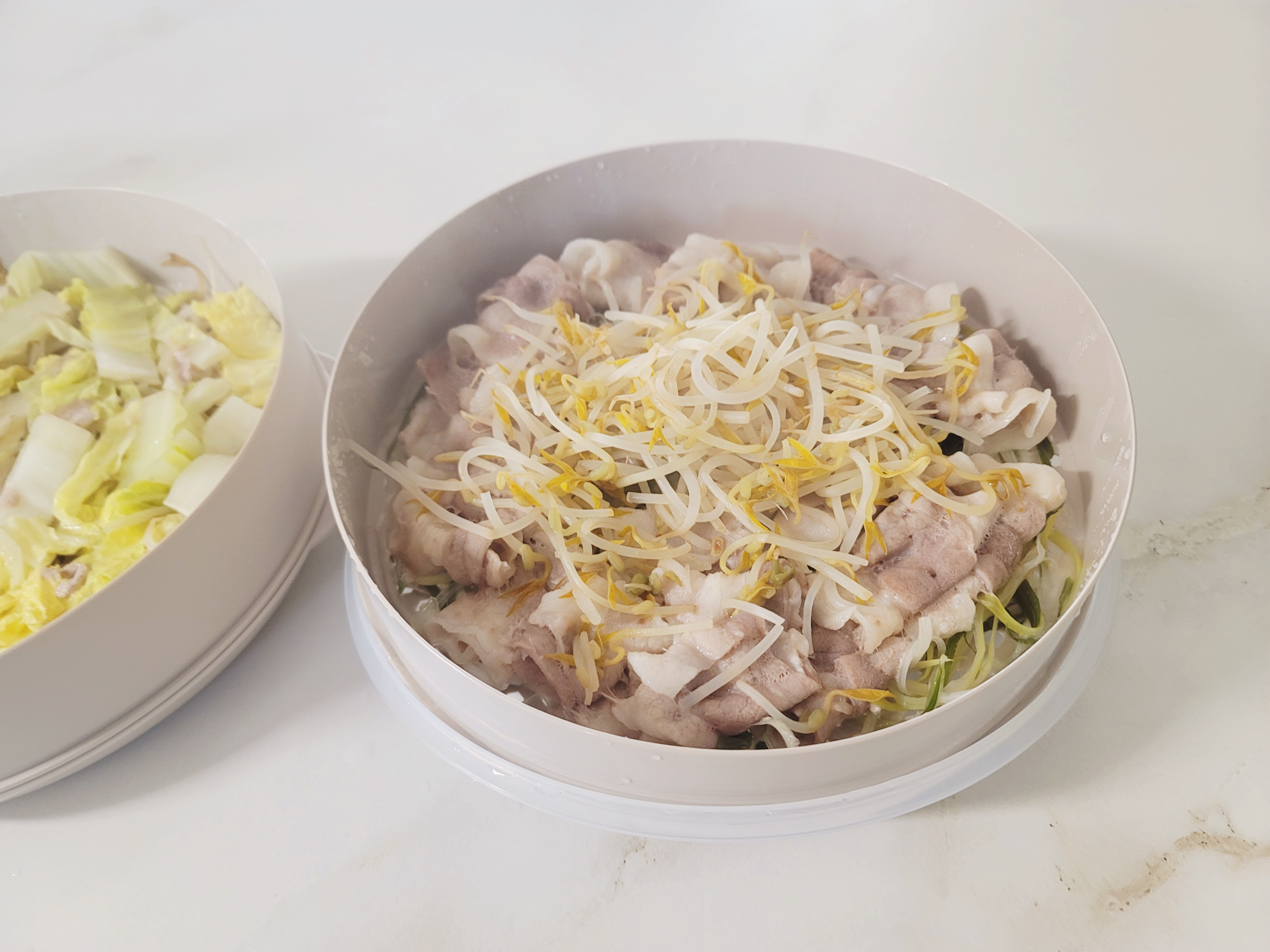 저는 간단히, 배추와 숙주와 대패삼겹을 이용해서 찜기에 다 넣고 쪄냈어요.