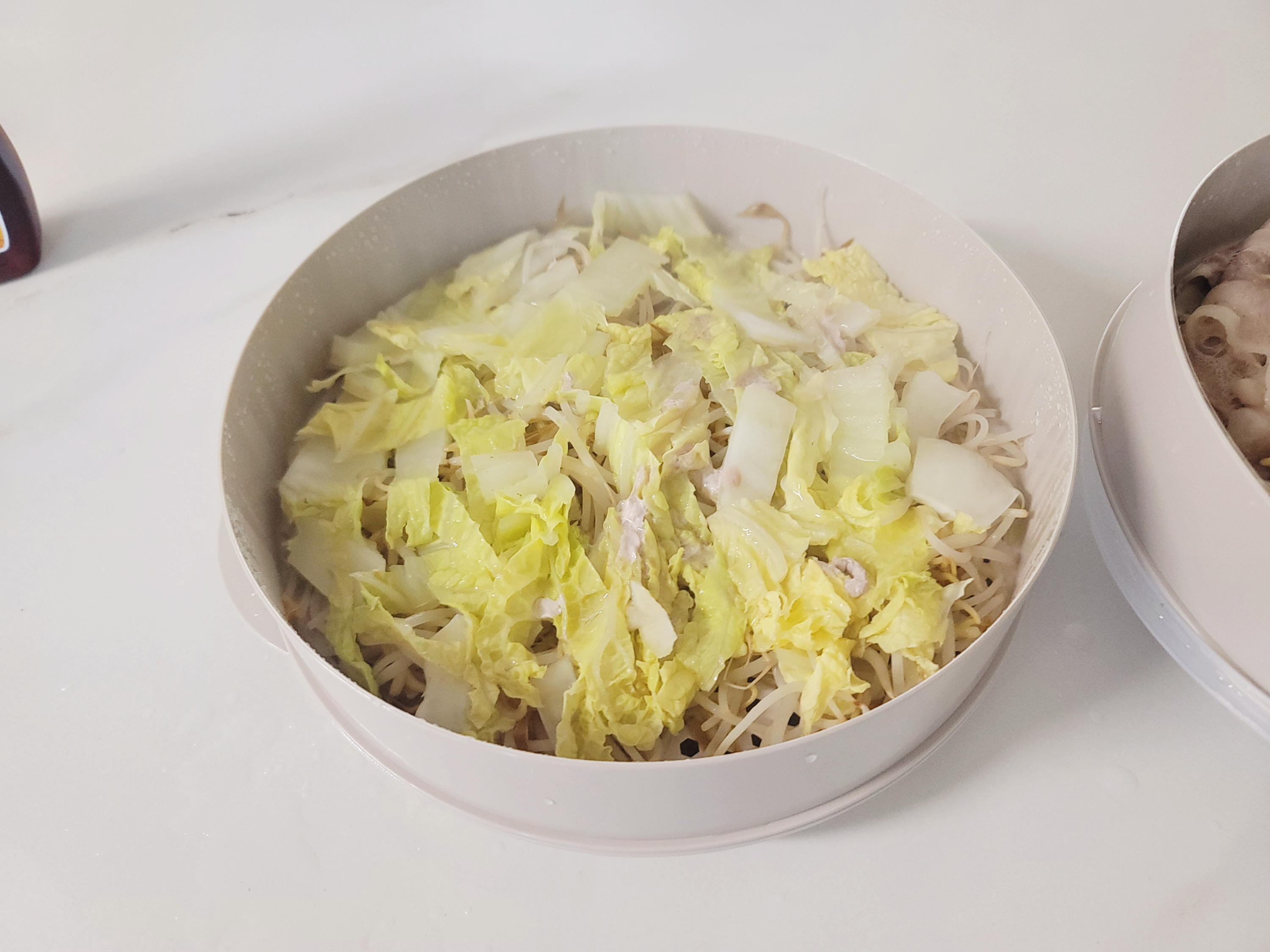 2단용 찜기를 사용해서 아랫단에는 숙주와 배추를, 윗단에는 고기랑 숙주를 더 올렸어요!!